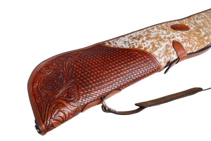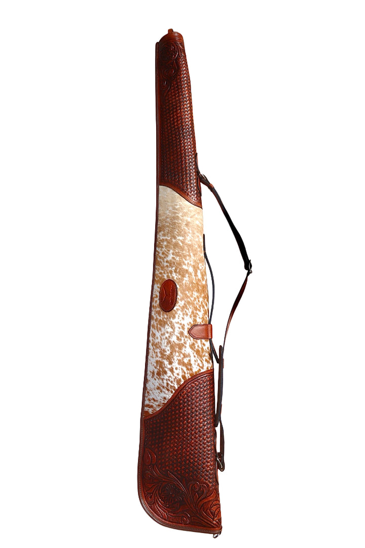 The hand-tooled basket weave and floral carving tell a story of craftsmanship passed down through generations of saddle makers — rugged, refined, and made to endure. Fully lined, it protects your single-shot rifle with the same care you’d expect from a custom saddle.